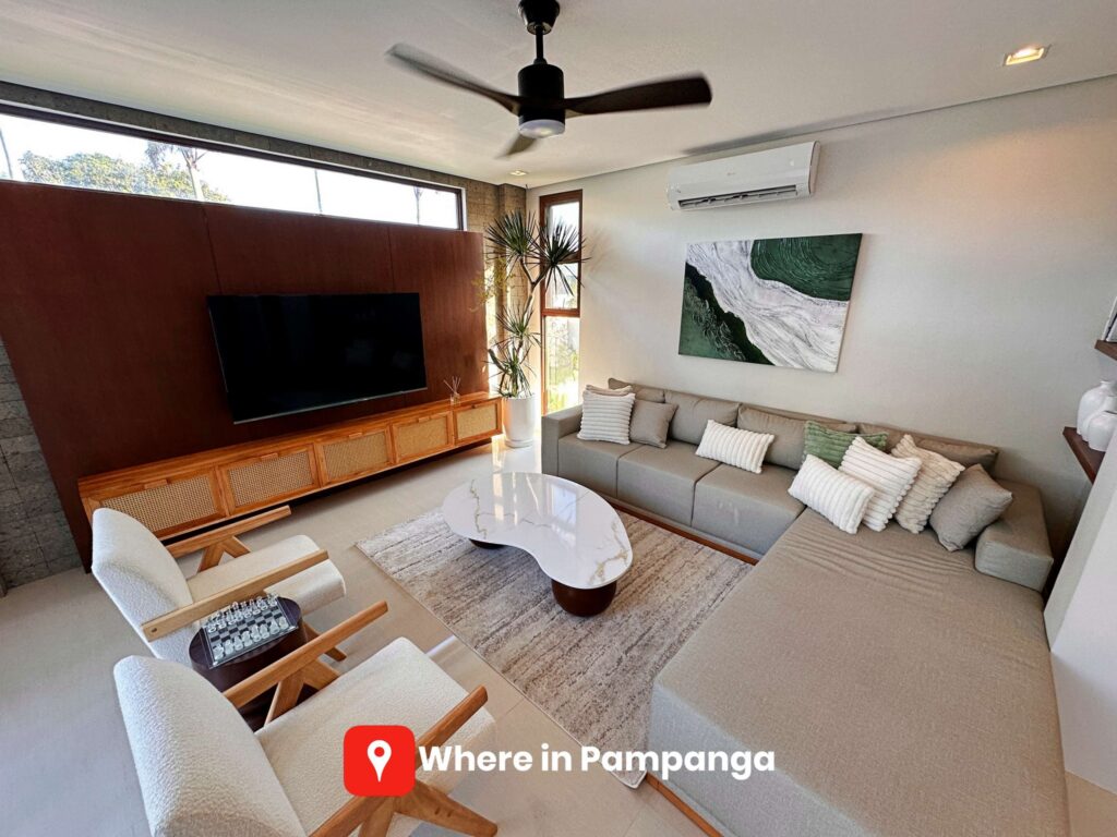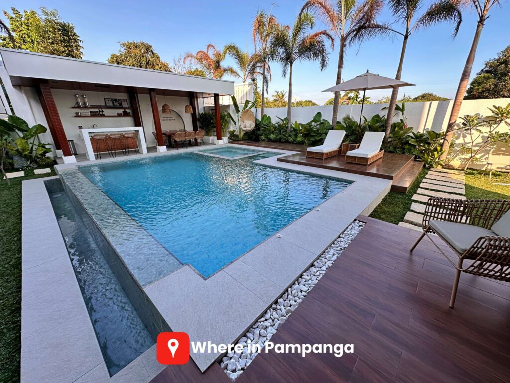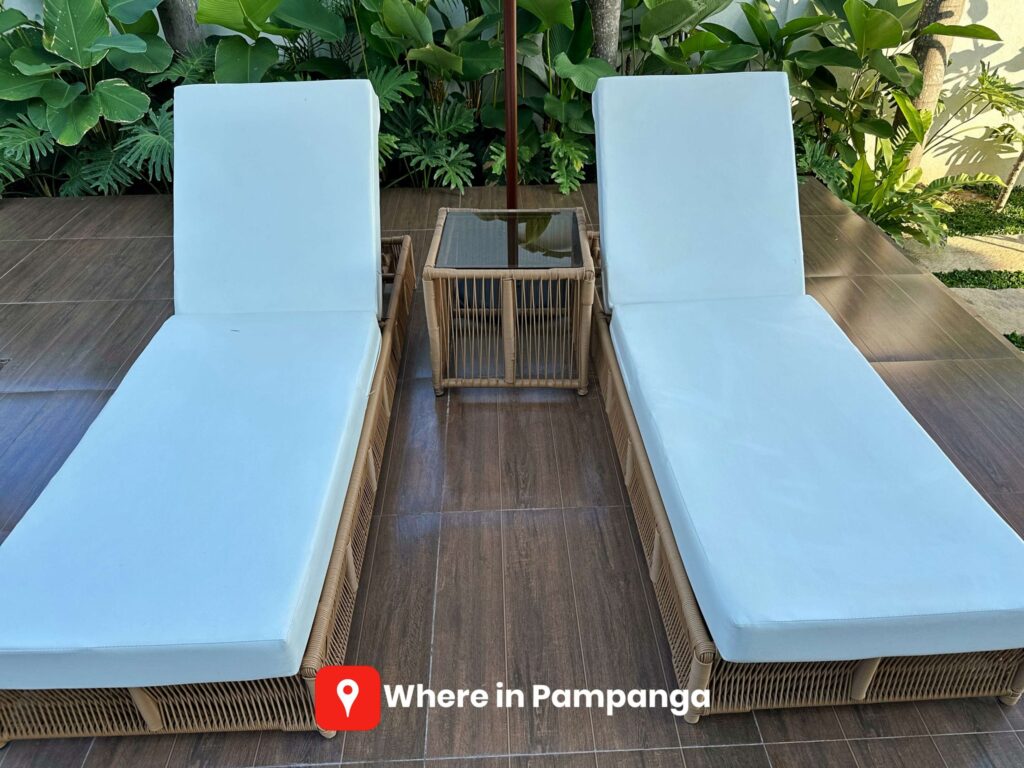 The pool is thoughtfully designed for different needs. Families with young children can enjoy the shallower section tailored for safe play, while adults can relax in the main pool, ideal for swimming or cooling off under Pampanga’s tropical sun. Surrounding the pool are lounge chairs and outdoor sofas, creating inviting spaces for sunbathing or enjoying a quiet drink.